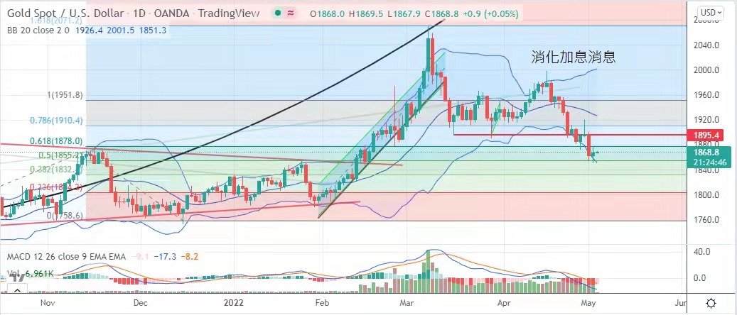 正逐步消化美聯儲將更積極收緊貨幣政策的預期。預料金價短期仍要再測試1850美元的支持。