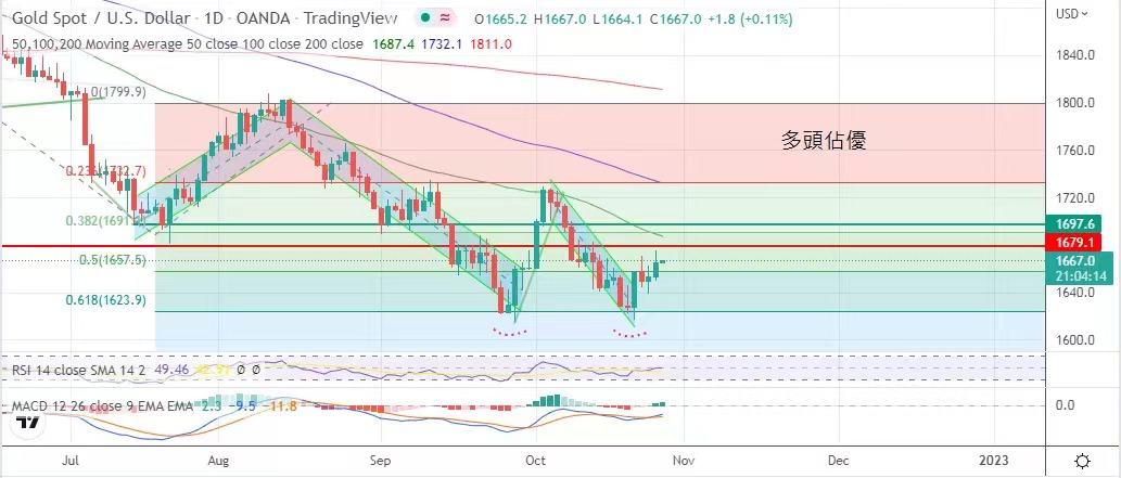 0.5%, which is lower than the market expectation of 75 pips, stimulating the upward price of gold. The highest price of gold was $1,675, the lowest price was $1,649.8, and finally it closed at $1,665.2.