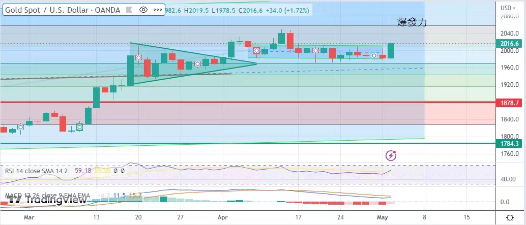 The number of floating job openings in the U.S. fell to 3.9 million in the latest March data, the third straight monthly decline and a near two-year low. The gold market rose above $2000 after the data showed that the demand for labor in the US is slowing, which will help ease the momentum of wage growth and thus limit inflation in the US and ease the pressure on Federal Reserve policy makers to raise interest rates. Gold traded as high as $2,019.5 and as low as $1,978.5 before closing at $2016.6. It's $34.