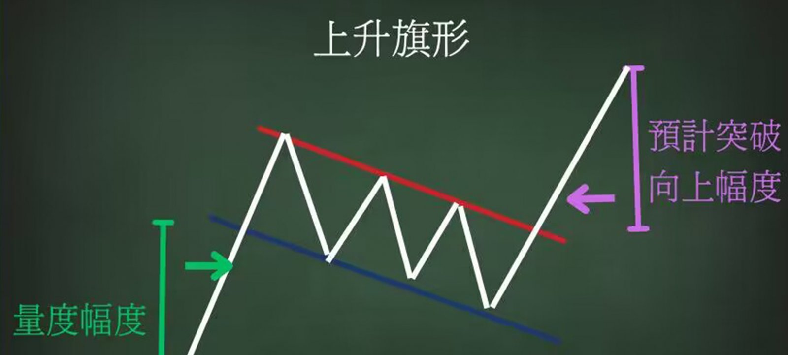 Flag shape means that the price rises or falls sharply (flagpole) first, and then walks a short-term ascending or descending track (flag body) in the opposite direction. The shape is like a flag, which is divided into an ascending flag shape and a descending flag shape: