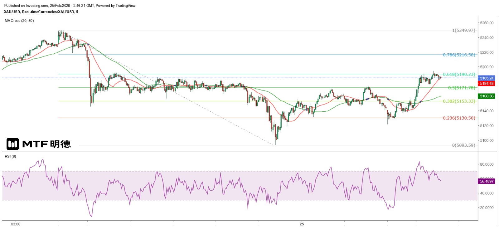 In fact, the low point this morning was already significantly above the 135-degree angle of $5,110, indicating that gold has regained its footing above $5,100. Currently, the probability of the price moving towards $5,260 is relatively high. The median between the two, $5,185, can be regarded as the dividing line between bullish and bearish trends. Meanwhile, $5,147.5 (the median between $5,110 and $5,185) is an important support level. Therefore, even if the gold price fluctuates below $5,185, as long as it remains above $5,147.5, it cannot be said to be weakening. Additionally, the 20 and 50 SMA on the 5-minute chart can be seen as strong support or reversal points. Investors should not set their stop-loss levels above these two SMAs. On the contrary, when the gold price drops to either of these SMAs, it can be considered a buying opportunity.