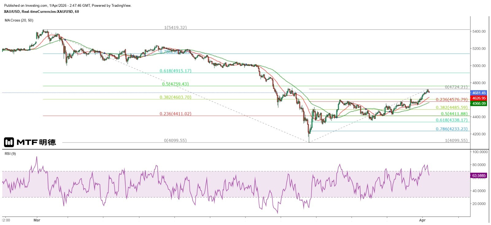 The financial market responded positively. The three major US stock indices rose sharply last night. The Nasdaq Composite Index jumped nearly 796 points, or over 3.8%, the S&P 500 rose nearly 185 points, or over 2.9%, and the Dow Jones Industrial Average also climbed over 1,125 points, or nearly 2.5%. With the inverse relationship between oil and gold persisting, the gold price broke through the psychological resistance of $4,600. The spot gold price reached as high as $4,724.21 this morning, approaching the 50% retracement level of the biggest decline since March 2nd, which is $4,759.43. The next level is at the 45-degree angle of Gann's theory at $4,810. In other words, the gold price is approaching a short-term strong resistance.