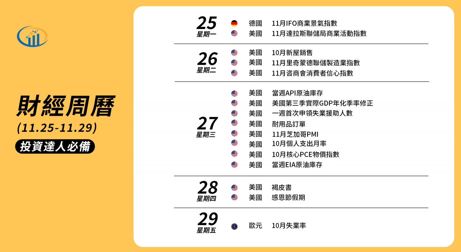 今晚美國將公佈達拉斯聯儲局商業活動指數,數據影響性較少,而本週為美國感恩節假期,市場假期氣氛會較為濃厚,週末部份經濟數據亦會提前公佈,投資者需要留意。