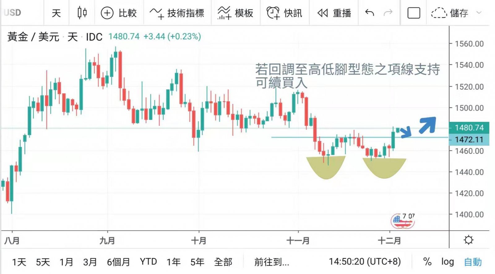黃金跌至1450持續有實質買盤支持,今年累積升幅已過一成,昨日借勢大幅攀升,年底相信處於1450上方收盤,