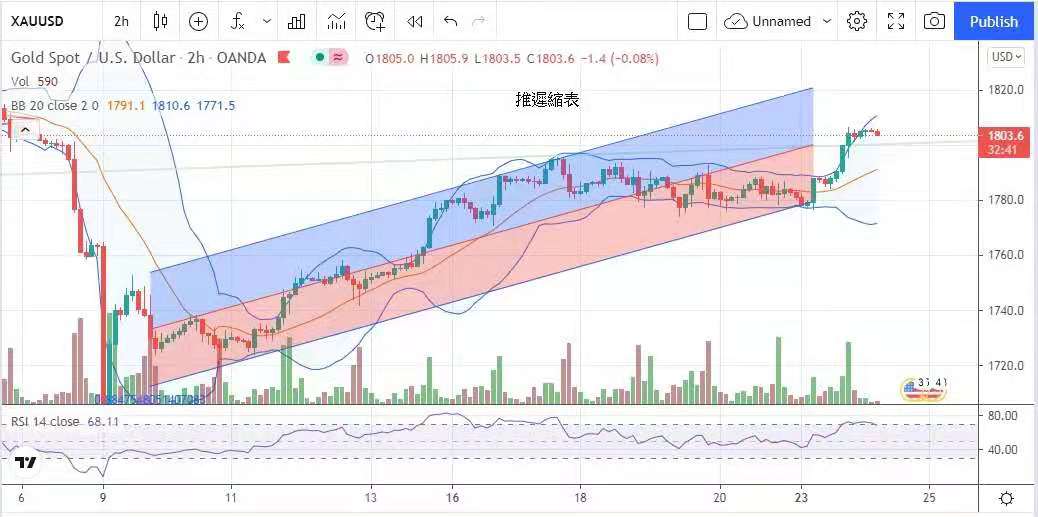 中東局勢緊張,黃金的避險價值再被放大,加上美國新冠疫情嚴重,美聯儲卡普蘭說可能改變他對應該立即縮減購債規模的立場,言論亦肯定了市場預期美聯儲將推遲縮減買債的看法,美元指數急回,金價升穿1800美元的重要心理關口,強勢盡現。單以圖表走勢而言,金價在1813美元才有明顯阻力,升穿該位則1828美元可期。預料金價今日在高位整固,建議波幅在1798-1813之間。