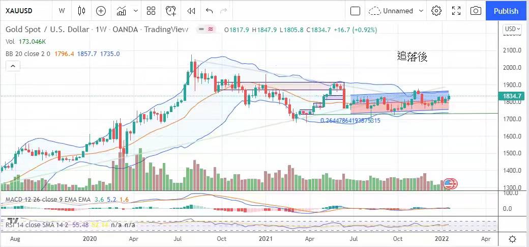 國際油價創2014年以來高位,這除了反映最近的歐洲地緣政治問題,也顯示了全球病毒大流行所造成的供應鏈短缺問題,更突顯價格扭曲變化的嚴重性。面對近50年代以來最大通脹壓力,再對上一個星期,多位美聯儲官員發言表示支持在3月加息的可能性建議。上周聯儲官員進入禁聲期,市場再沒有收到他們的聲音,但估計他們的論調仍在市場中迴響,但金價在今周亦照樣上漲,主要是避險情緒升溫,美國在加息的大前提下,風險市場表現疲憊,而比特幣價格跌近三萬五美元,亦促使資金轉泊至較傳統,及價格亦相對落後的黃金市場。最後,是俄羅斯與烏克蘭有爆發戰爭的可能,都成金價利好因素。金市在上星期衝穿1830美元,金價上周最低見1805.8美元,最高見1847.7美元,最後以1834.6美元收市,總結一星期,金價累升16.6美元。
