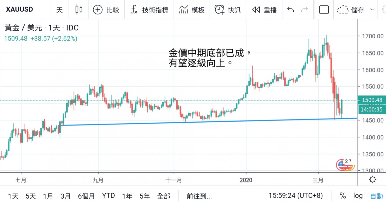 下方1450可确认为中期底部,逢低吸纳。而此段美元涨势出现回吐后,亦相信会有资金重新吸纳黄金以作避险对冲。