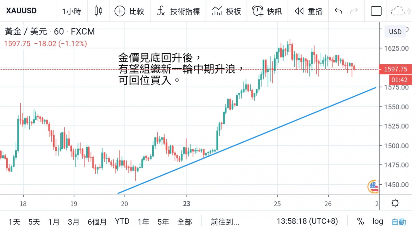 走势不一,而金价则在周二大升百多美元后,高位回吐。今晨最低回见1597美元,一度失守千六关口,高位略见抛售压力,但整体升势仍有望持续。