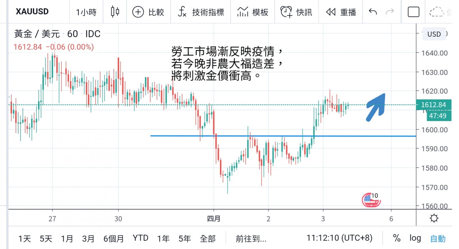 金价重上1600上方,但今晚美国的非农业新增职位及失业率为全周重点,而且劳工市场定必恶化,势令市场再现波动。