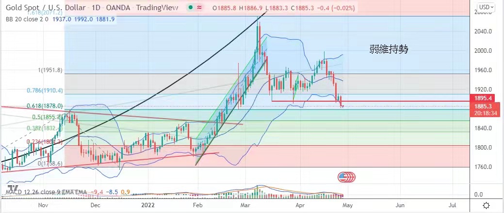 指数突破103关口,黄金昨日承压,昨日暂失守1890这个支持。在俄乌战事持续之下,长线则仍有其吸引力,短期黄金仍是弱势,可能再试俄乌战