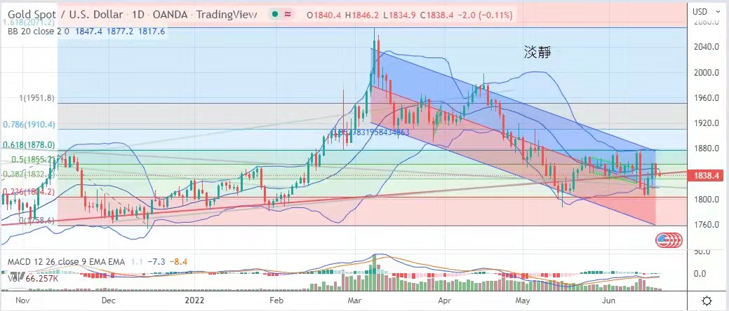 讲话,金市相对淡净,波幅不足12美元,金价最低曾见1834.8美元美元,金价最高见1846.1美元,最终以1838.4美元收市,跌2美元 。