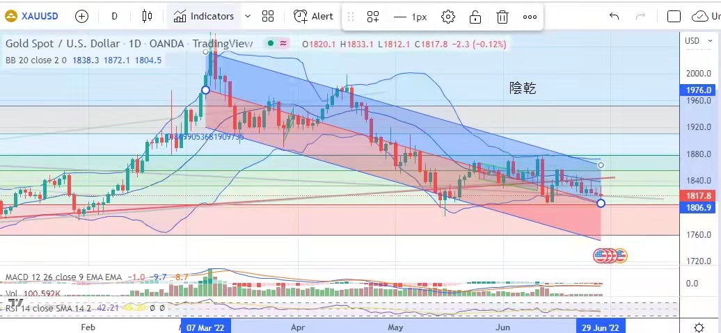 欧美央行行长暗示将坚决以加息去压抑通胀,在他俩发言后,金市明显受压,即时从昨日高位的1833.1美元下滑近15美元,金价