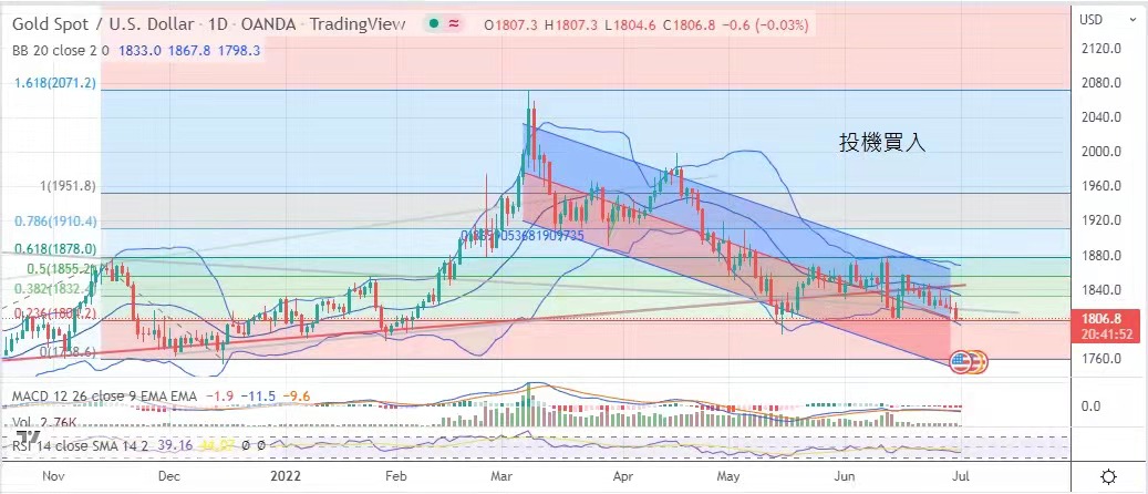 美联储主席鲍威尔表示决心以加息去压抑通胀,暗示本年度加息不会手软。金价近期明显受压,昨日跌近1802美元才有反弹,