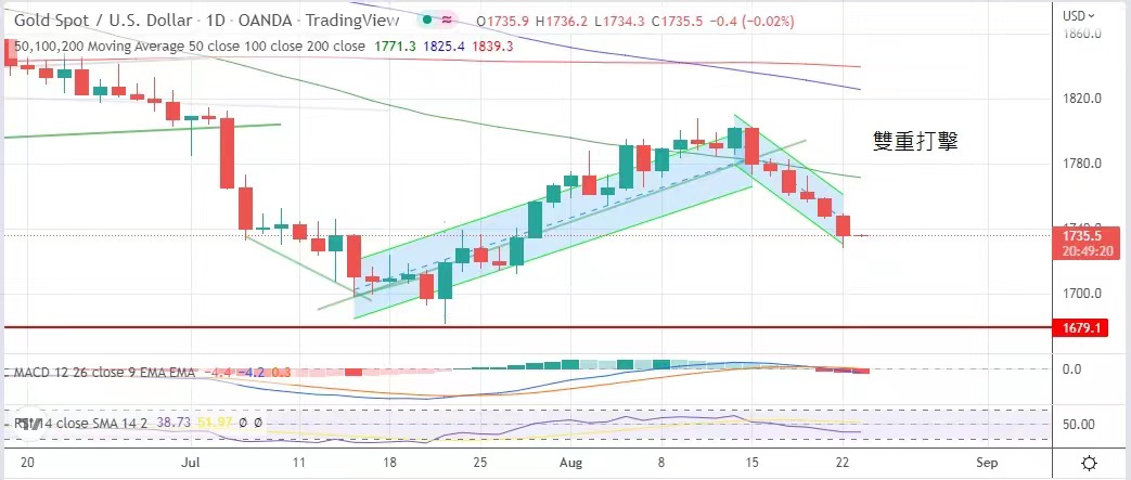率升穿3%,金价在双重打压之下连跌六日,支撑点不断向下,预计后市仍是跌多升少,下一支持位在1725美元,跌