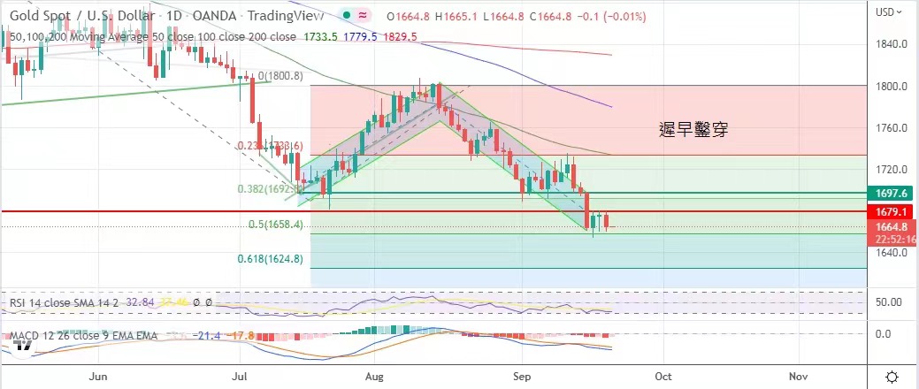 行布置。金价最高升1679.5美元,最低见1660美元,以1664.9美元收市,跌10.9美元。