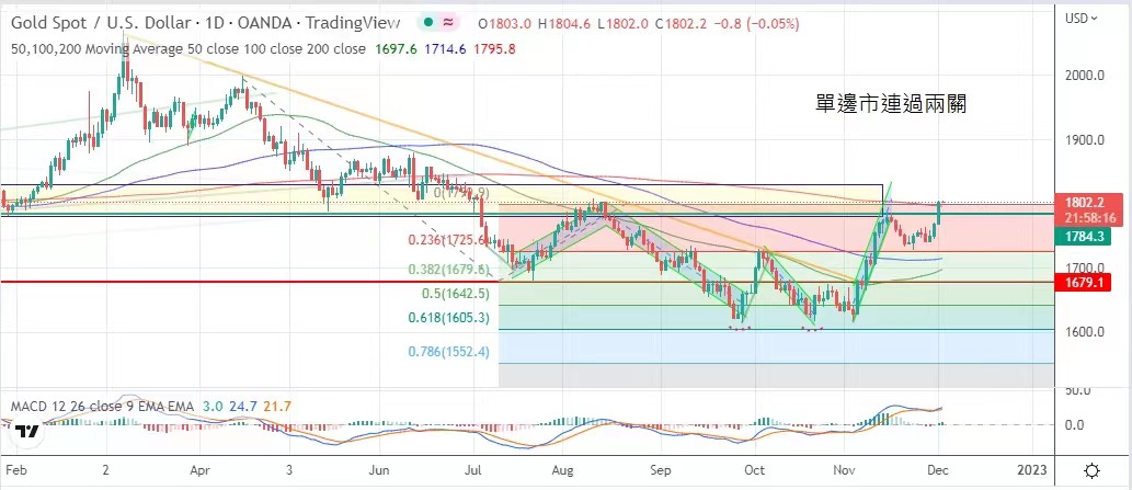 多次激进加息之后,通胀上升压力已经得到纾缓,市场憧憬联储局将会提早减息,金价连续升穿1784及1800美