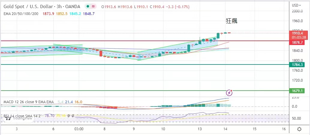 可能不再坚持更紧张的加息政策,美国长短国债孳息率下跌,金价在美市时段突破1878美元的横盘,最高见1914.美