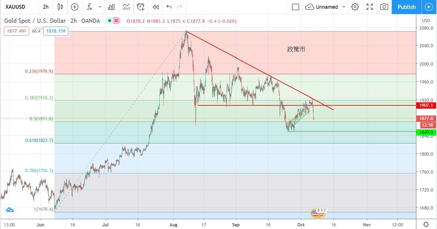 美国总统特朗普的一封贴文令美股大跌,黄金也难独善其身,投资者偏向持有美元令美元指数升值,昨日金价受压,从最高位的每盎司1921美元下跌,跌至接近昨日低位的每盎司1878美元收市。昨日金价表现除了受政策影响,技术走势上亦有调整的需要,金价走势先是受制于8月高位的下降趋势线,而且三番四次试图突破1918不果,而1918也恰好是6月低位至8月高位的费波回归线的0.382所在,调整完毕对黄金后市更健康。