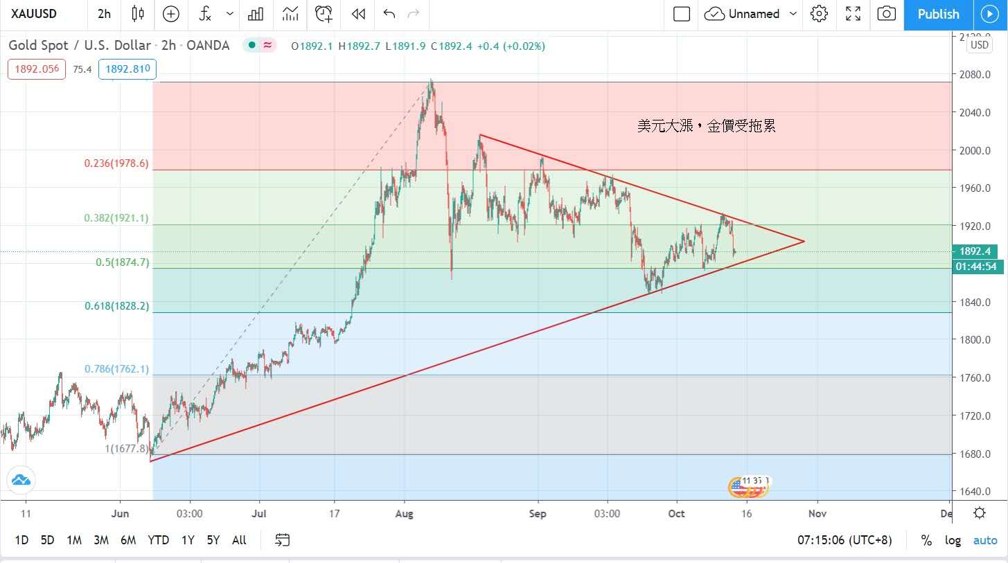 美市时段美国新一份疫情纾缓方案的再度推迟消息,使美元大涨,金价受拖累,收市报每盎司1891美元,跌32美元。金价受投资者注视美元而转弱,或会再度考验1880水平。