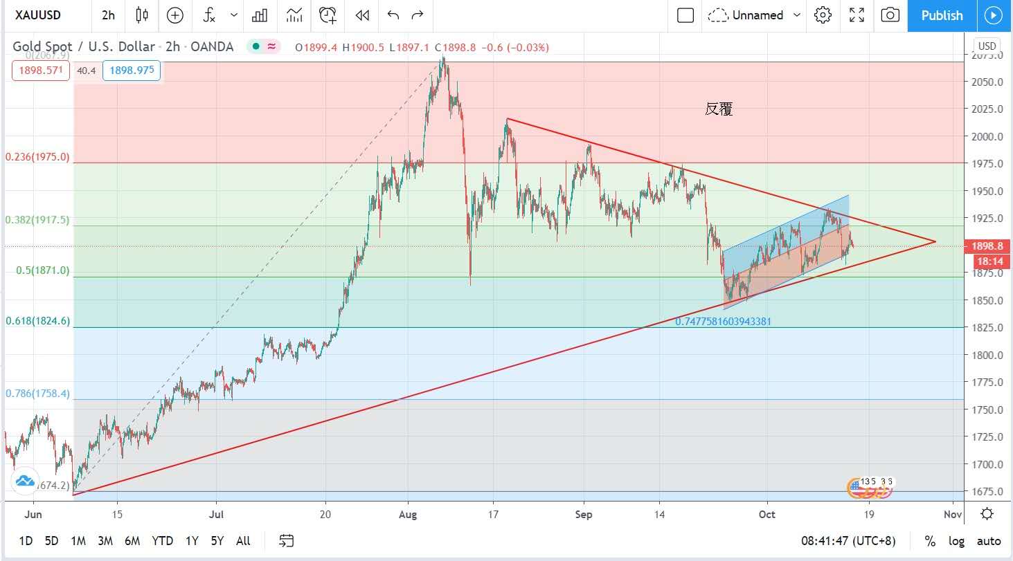 最终报每盎司1902美元,涨10美元。金价受仍未跌穿上升趋势线,并与下降线作出收敛三角形,正在寻求突破机会。