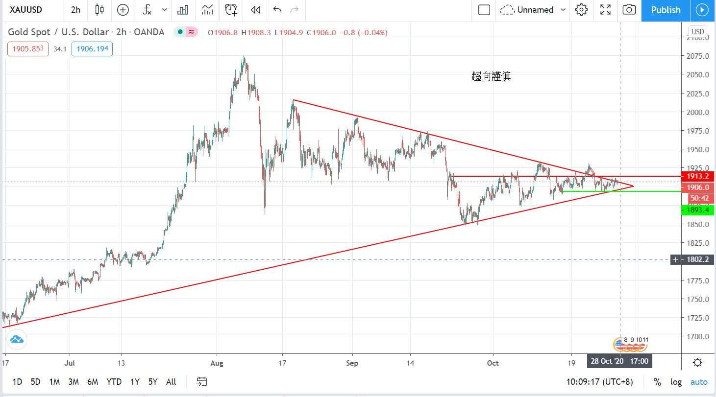 最高则只升至每盎司1909美元,最低做每盎司1898美元,新冠疫情在欧美恶化原有利提升黄金的避险功能,但美元指数重返93点水平,压制金价的升幅,加上总统大选在即,