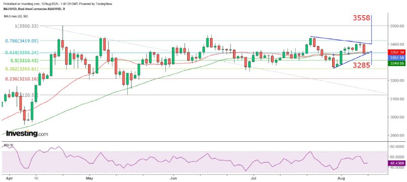 昨天现货金价收在3349美元,略低于50日SMA(3349.6),今早已攀升至3355美元以上,若50日SMA再度成为支持,则金价日内,甚至短线有机会呈收窄三角形发展,由于昨天的高低位分别触及三角形上升及下降轨,在出现突破性走势之前,金价短线倾向于3340至3405美元上落。从金价在今年4月创3500美元新高后的走势观察,其主要集中在高位回调21.4%(3419)至61.8%(3265)之间上落,目前则大约在回调38.2%(3355)的水平徘徊,金价若收高于3419美元,或收低于3265美元,将视为准备突破的警号,否则仍呈横行状态。
