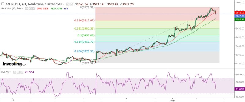 今天在亚洲市早段所做暂时低位3552美元,较昨晚纽约市高位3578.5美元下跌26.5美元,其走势与8月27至29日相似。不过,8月27日,金价在当天早上6时于3394美元触顶,跌至中午12时于3374美元见底反弹,累跌20美元。8月28日,金价同样在早上6月时见顶,触及3399美元后下跌,但最低仅见3384.7美元,跌逾15美元后再反弹。8月29日,金价于凌晨3时触及3423美元后开始下跌,持续至晚上7时,低见3404.5美元后才反弹,最多下跌18.5美元。