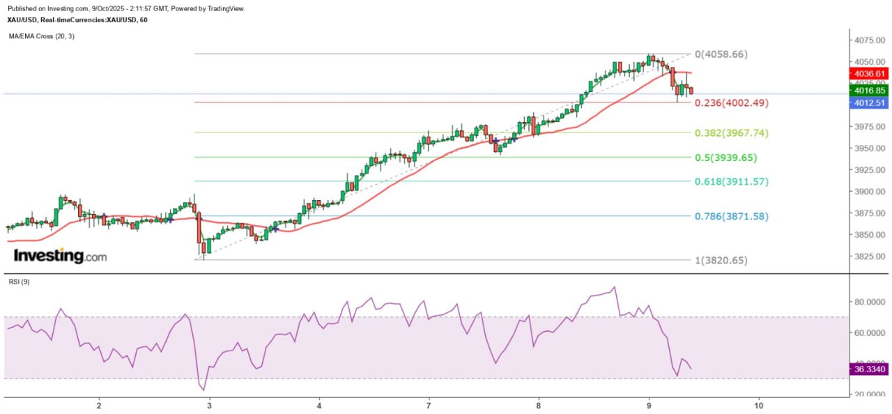 金银价格在昨天纽约午市开始力弱,并双双从高位大幅回落,金价在今早亚洲市低见4001.75美元后再度攀升,早段曾高见4036.42美元。由此反映,4000美元已成为金价新的强支持位,其次就是金价目前处于江恩正方形4010至4060美元波动。不过,投资者亦须注意,金价在小时图已连续5小时收低于20SMA(4037.45),是10月3日以来最长时间,该线视为短期反弹阻力。