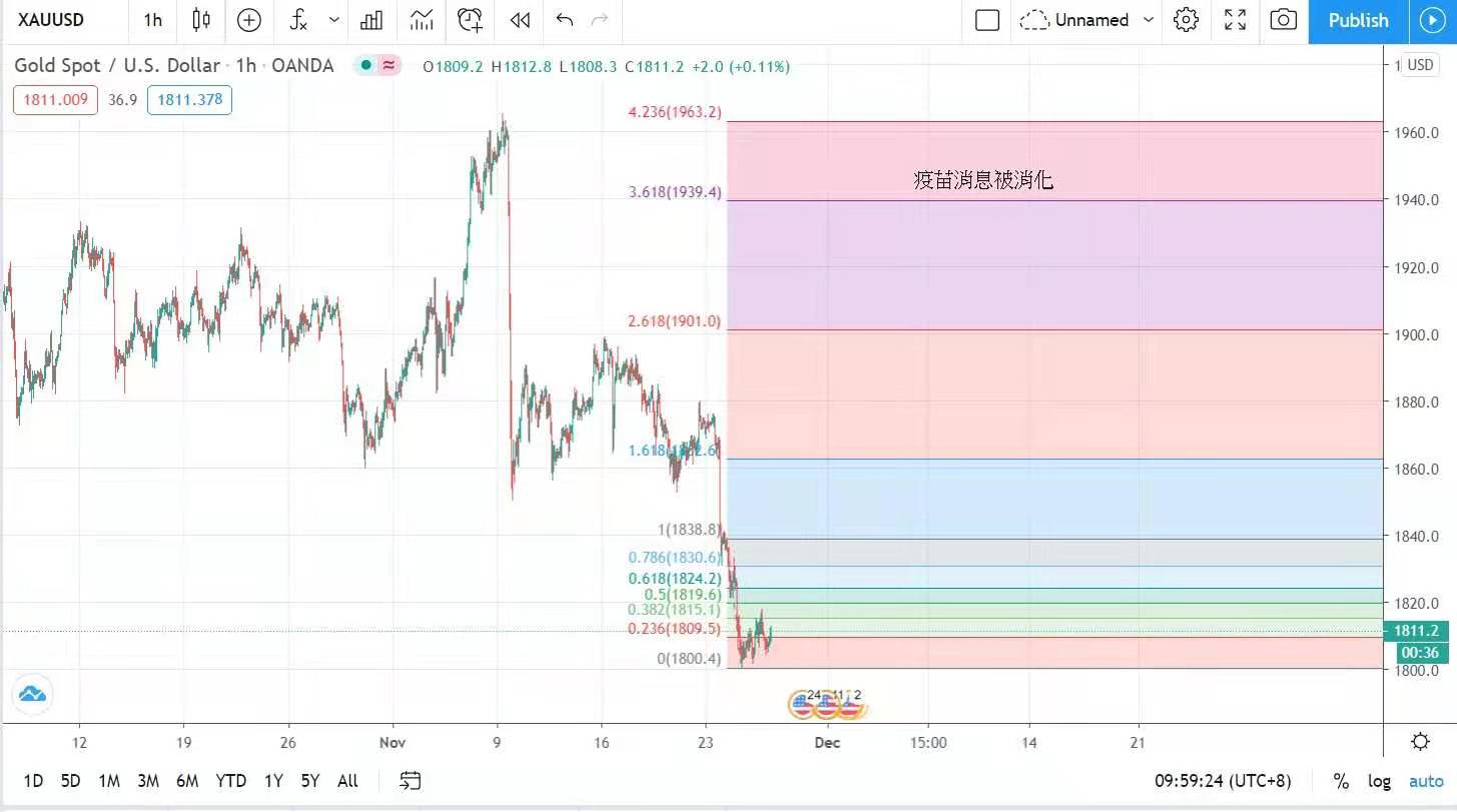 最终于每盎司1808美元平收,无升跌。黄金虽然暂时受疫苗消息打压,但在全世界央行实施量化宽松,与及持续低息的环境下,待疫苗消息被消化后,