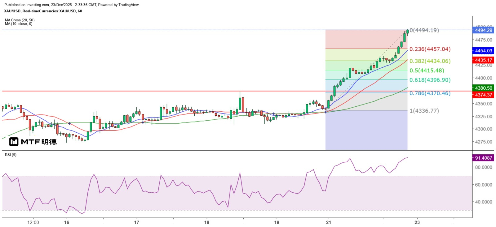 金价气势如虹,现货金价突破4400美元关口后续创新高,在今早亚洲市曾高见4490.66美元,直迫4500美元。这轮金价的升势与感恩节及圣诞节行情有密切关系,金价的上一轮突破是在11月28日,刚好是美国感恩节假期过后,其升破了收窄三角形下降轨,属于明显的技术突破,其后持续横行整固,12月12日上破4300美元,后再横行整固且未曾收低于该位。今次在圣诞节假期前破顶创新高,预示明年初将会持续上行。