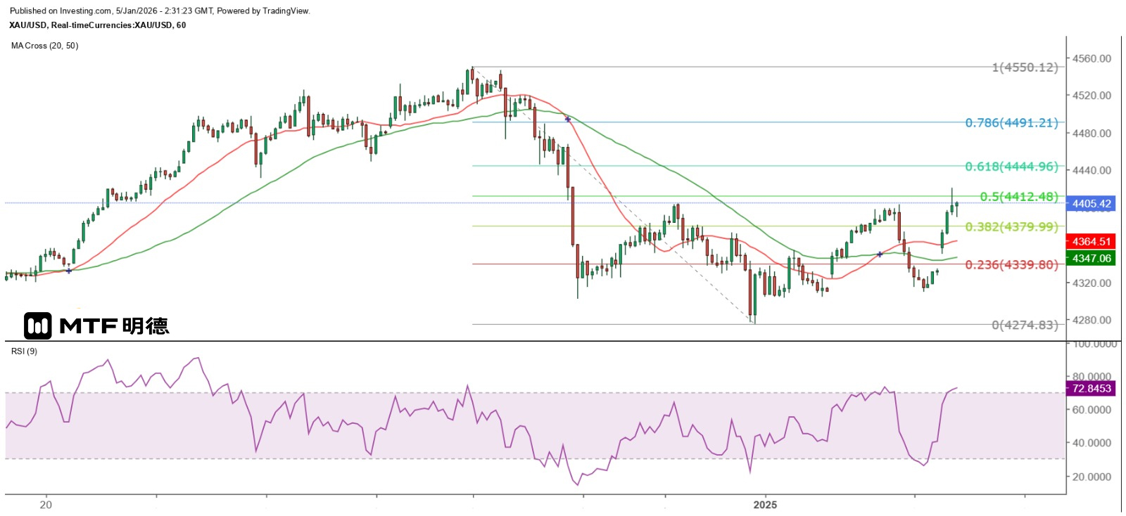 短线而言,金价明年受制于4410美元的江恩正方形270度垂直角阻力。从小时图渐见,现货金价在12月29日跌穿4400美元后呈横行形态,虽然今早的高位4220.2美元,略为升破上周以来最大跌幅之50%反弹位4412.48美元,但未能守稳在该位以上,故暂时仍将4410及4412.48美元视为短期重要阻力,而上周五金价曾低见4309.87美元,即略低于225度角的4310美元,故预料金价短线极其量维持在4310至4410美元上落。然而,金价在12月29日几乎以穿头破脚大阴烛收市,预示金价已在4550美元触顶,后市倾向下试日线图50SMA(4201)后有望强力反弹。