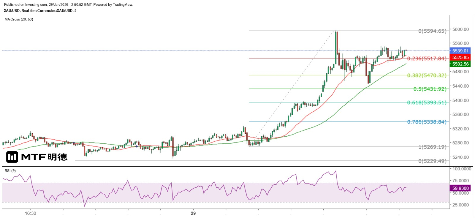 现时从技术角度看,只能从1分钟或5分钟图表进行分析较实际,而20及50SMA仍然是主要的移动平均线支持。从5分钟图可见,今早金价的回调低位5446.64美元,仍然较50SMA高近10美元,换言之,现时的短线操作风险已大幅上升。现时5550美元为超短线阻力,从江恩正方形观察,5560美元位于270度垂直角,故属强阻力所在,下一级较具阻力的价位则为5710美元,支持位则为50SMA(现约5500),下一级较具支持的价位则为5410美元。