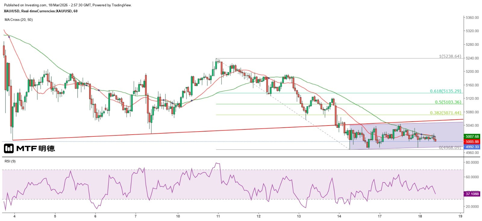 故此,短期油升金跌的情况或会持续,但不会持久。目前投资者需要注意的是,一旦联储局今晚宣布维持利率不变,金价是否会大跌,尤其如跌穿5000美元后能否迅速重返其上,以及金价会否连续两个交易日收低于日线图50SMA(现约4977),如此将对金价不利。此外,SPDR持仓量从3月2日的1101.33吨逐步下降至昨天的1069.56吨,反映了金价在美以伊战事期间持续受压,而金价近日仍未能摆脱5000美元的沽压,日内失守的可能性增加,但4960美元仍然视为强支持位,只是短期波动区下限或下移至4960美元,5060美元则为主要阻力。