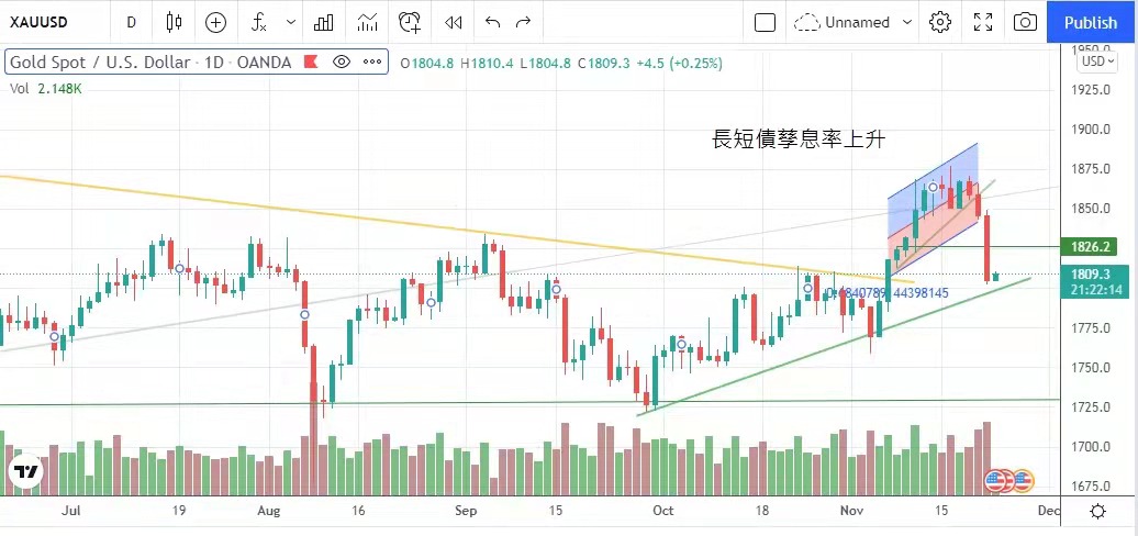 鲍威尔获续任,市场预期美联储将提前完成缩表,并提早加息。消息迅即推高长、短期的美国债券孳息率,金价昨日大幅度回调,但在息率上升的前提下,