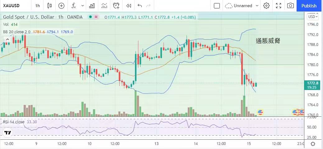数字公布后,美元指数及十年国债孳息率曾分别上升45及6个点子,金市明显受压,即时下跌逾12美元。金价昨日最高升至1789.5美元,最低见1766.6美元,