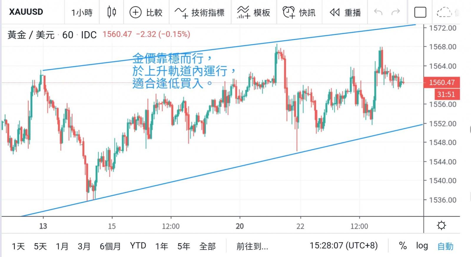 但以美元现时强势仍未对金价带来太大伤害,相信再突破机会较高,短线下方,只要继续守稳1557及1553支持,