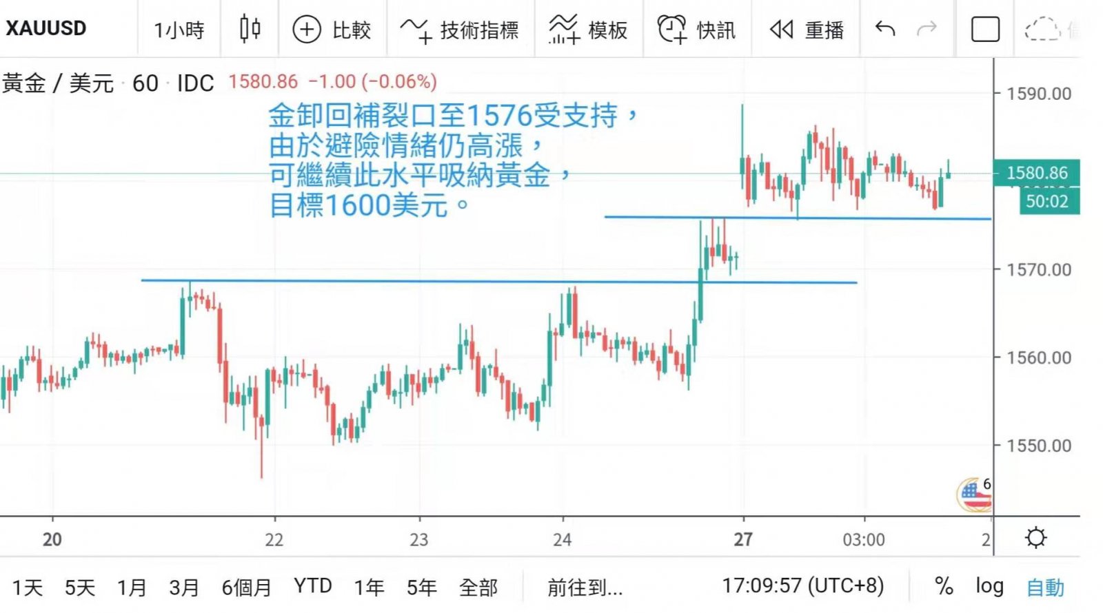 在亚太区市场已开始见买盘涌现。金价多返回吐,但亦收稳1575上方,仅回补跳空位置一半空间,大部份时间徘徊于1580水平。