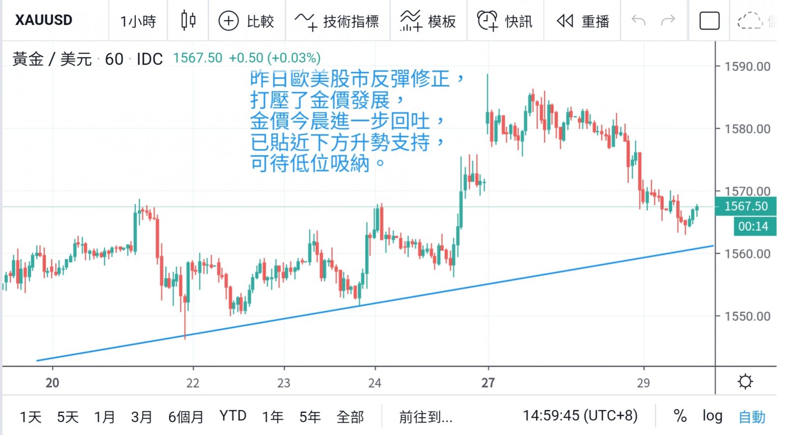 技术上,金价回吐已一步到位,今晨回吐至1563美元,从三周高位回落,跌幅已逾廿美元,