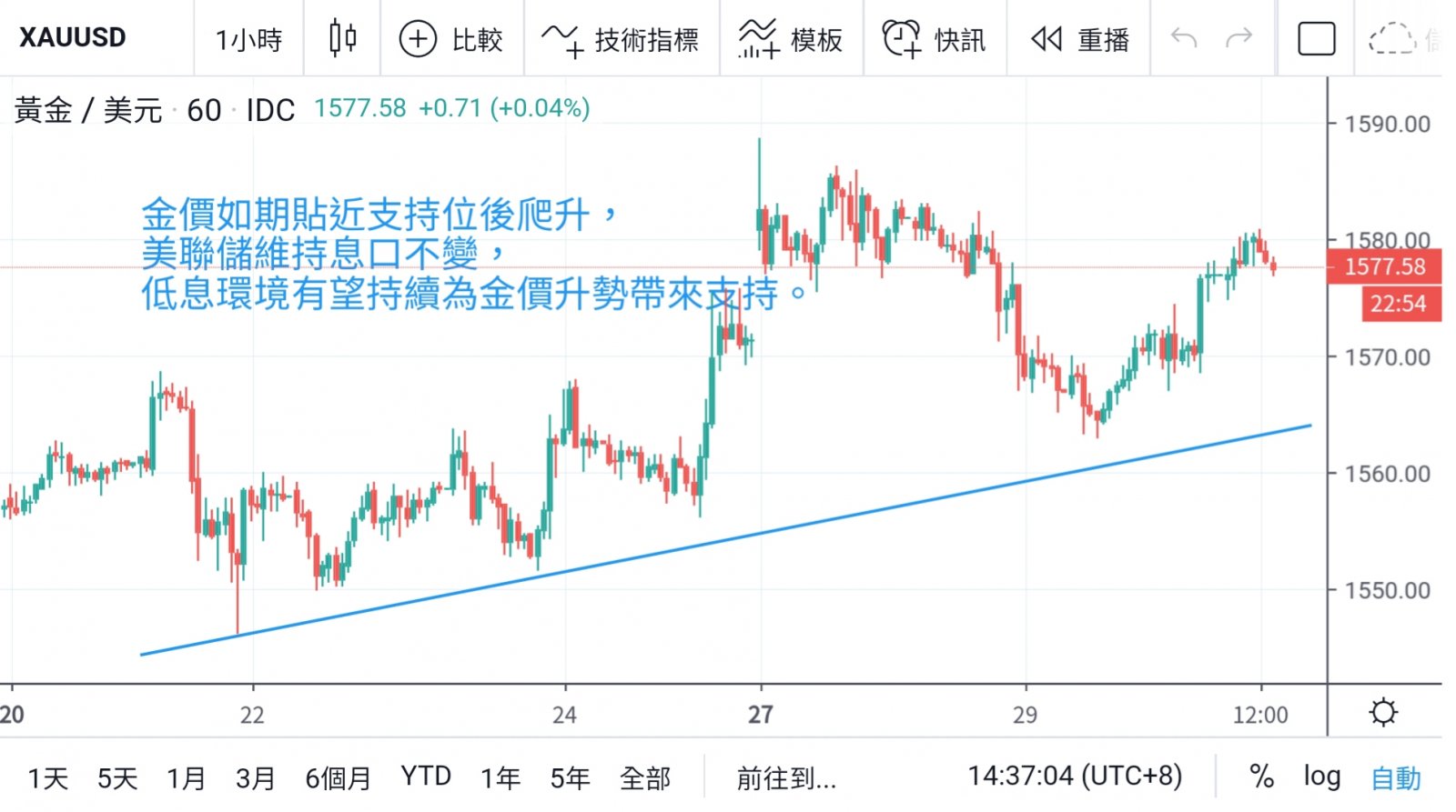金价因此晚上得到爬升动力,于深夜时份再冲击1580关口。延至今晨,金价仍然靠稳于1570上方,