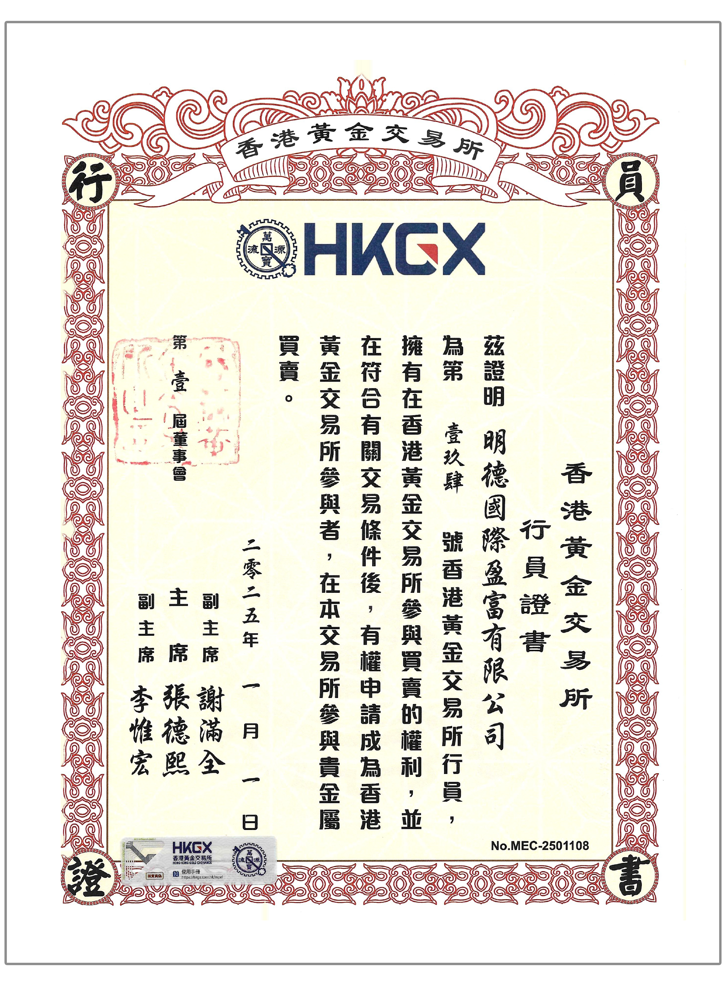 公司为香港黄金交易所(前身是金银业贸易场)AA类行员,行员编号194号,可提供实金和保证金交易服务