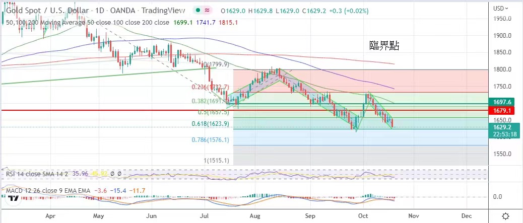 升,金價昨日下跌。預期美元指數及十年國債孳息率在美聯儲鷹派態度下仍將偏強。金價已跌至臨界點,隨時擴大