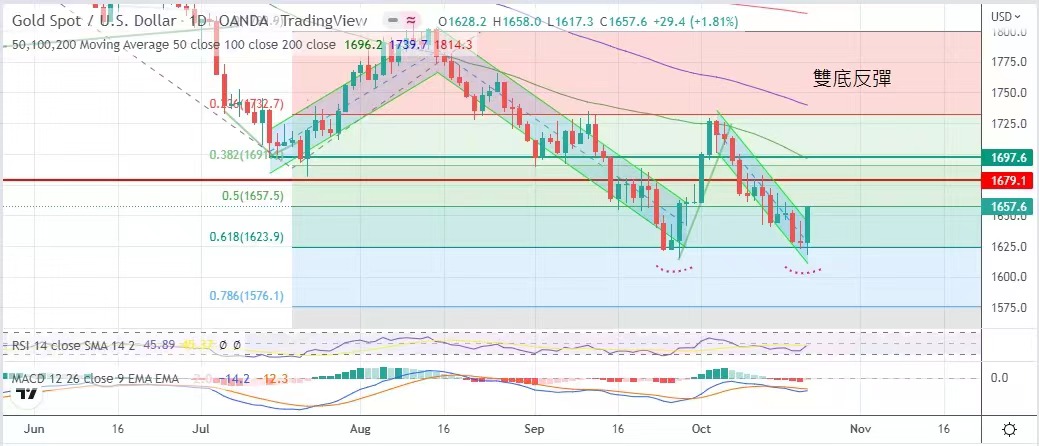 息率從4.3%回落至4.19%,金價上周反彈,金價上周最低見1617.3美元,最低見1668.5美元,最後以1657.6美元