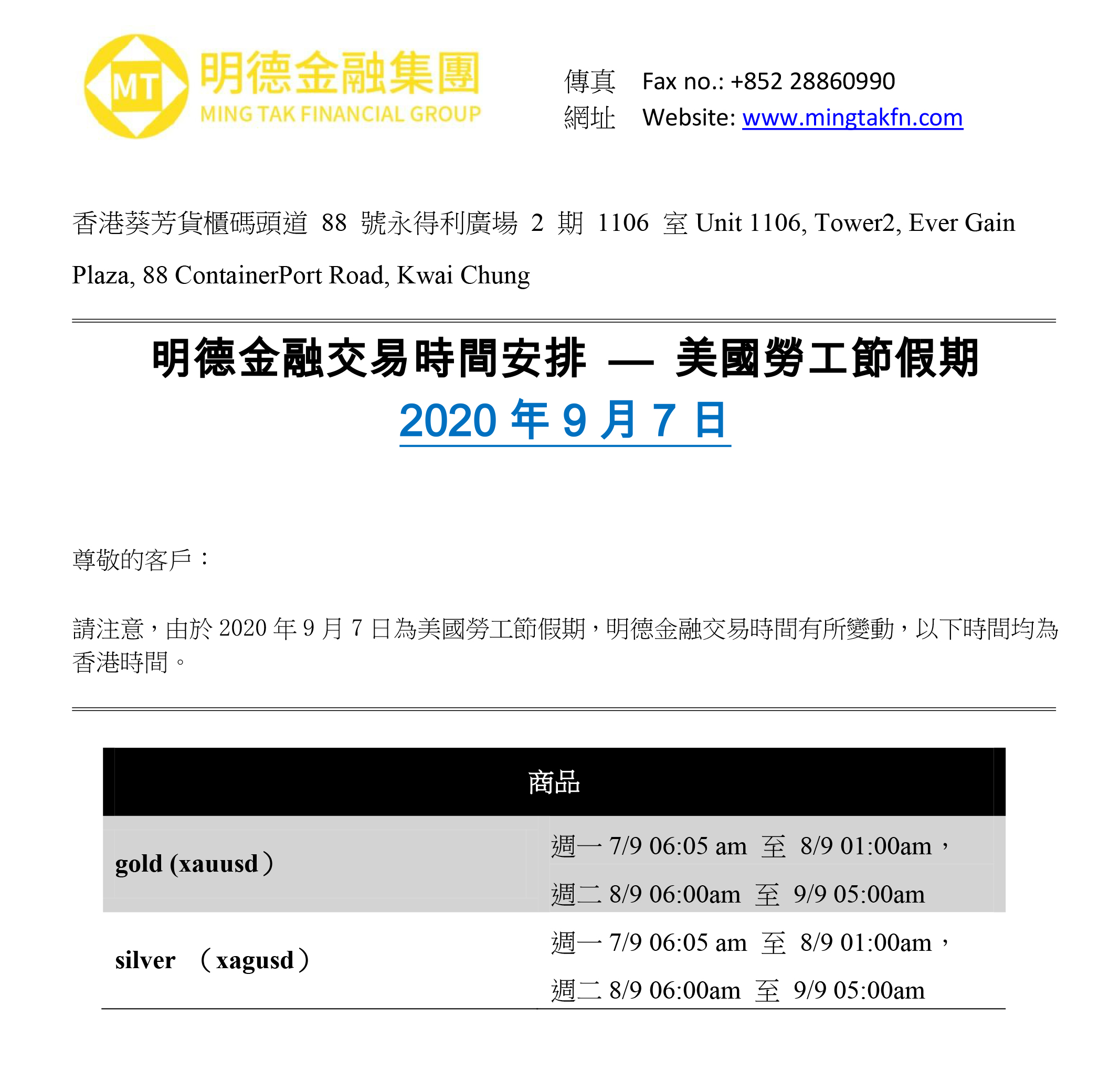 明德金融交易時間安排 — 美國勞工節假期