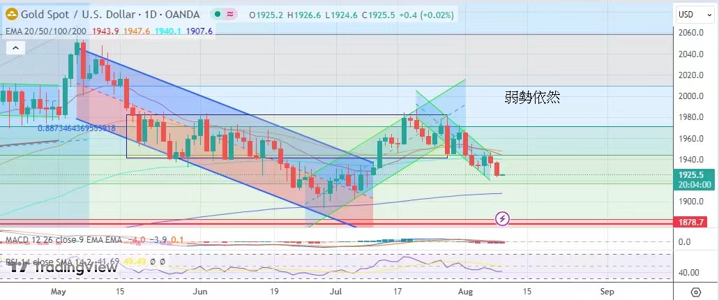 中位,十年期國債跌穿4%,金價受壓下跌,金價最高造1938.2美元,最低見1922.8元,最終收於1925.2美元,