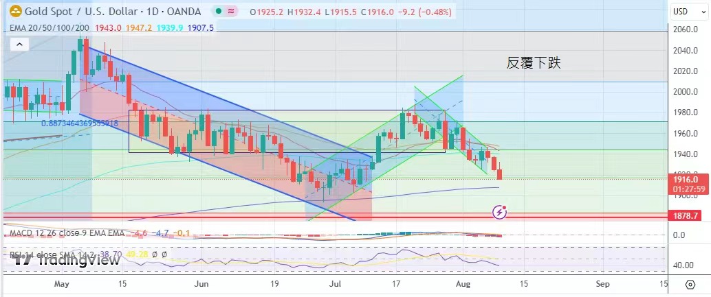 金價反覆下跌。金價最高造1932.4美元,最低見1914.1元,最終收於1915美元,跌10.2美元。