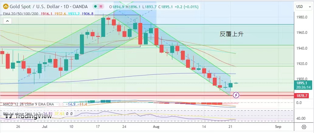 做高中間價,力挺人民幣保持平衡,人民幣最終在有形之手干預下反轉回升,金價最高見1898.8美元,最低高