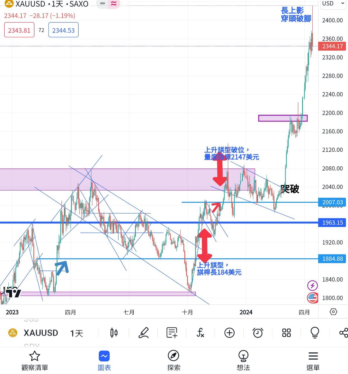 金價創新高後回吐,週末前舒緩超買壓力。黃金上週繼續強勢,近11個交易日中,有10個交易日持續創新高,無視前週表現理想的勞工數據,金價週初甫開市守穩2300關口便開始發力上揚,升至2350上方才開始出現爭持,上週焦點是美國的通脹數據及息口預期去向,週中公佈的CPI顯示通脹仍然高企,除高於預期外,更令人擔心的是如此高息環境仍未能有效壓抑通脹回落,市場急速冷卻6月減息機會,美元攀升打壓了黃金回落,但無阻黃金整體漲勢。有情報指伊朗將向美國發動襲擊,及近期央行的實質買盤支持下,金價跌幅有限,加上週四晚PPI升幅稍為放緩,黃金又再急升,週五晚更首度突破2400美元,自週一起已大升超過一百美元,惜高處不勝寒,週末前在美市回吐,引發鏈鎖反應,超買好倉紛紛週五收市前平倉,導致金價重挫,穿頭破腳而下,短期出現調整壓力。儘管市場基本面仍支撑市場全年黃金有理想表現,但技術走勢仍需尋找支持位置。本週市場較關注零售數據,及美聯儲主席鮑威爾的演說,金價調整過後,或出現理想中長線入市位置。市況點睇,不妨互相參考一下。