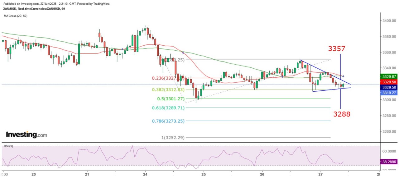 金價今天如未能以強勁的雙日轉向形態重返該線以上,則金價傾向進一步下試低位,目前小時圖走勢呈收窄三角形,即市以3288美元為首個下跌目標,如向上突破下降軌,首個阻力為20及50日SMA重疊的3329美元,進一步向上則以3357美元為主要阻力,而3371美元則仍是中期關鍵阻力。昨天金價最高升至3350.25美元,故昨天提到的費波納奇100%擴展跌幅所及的目標價變為 3252.29美元。