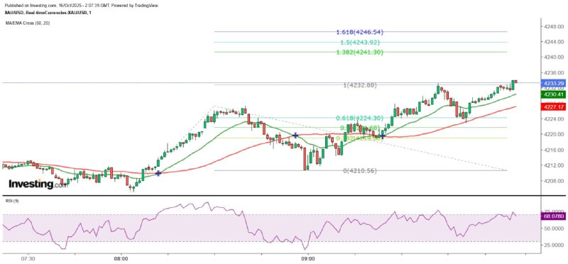 從江恩正方形觀察,目前金價處於4210至4260美元區域,由於4210美元屬於強支持(或強阻力),假設金價已守穩4210美元,則後市甚或日內很大可能將會挑戰4260美元。從5分鐘圖可見,金價剛完成了一個費波納奇100%擴展走勢,但回調至20SMA後同樣見支持並重拾升勢,故仍有可能進一步達到1.382、1.5或1.618倍才回調,短線須注意金價升至4233美元,或突破該位後可能形成的雙頂背馳,暫時4222.9美元可視成頸線,一旦失守量度下跌目標為4212.67美元,即接近4210美元的重要支持,屆時金價或再次展開升勢。