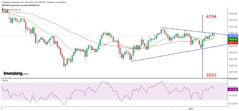 雖然今早金價收復了大部分失地,但仍下跌若10美元,且在4000美元關口仍見沽壓,以TD線量度小時圖的走勢,若金價向上突破下降軌,上升目標約為4094美元,跌穿上升軌的量度下跌目標則約為3853美元,在ADP公布10月就業報告前,金價本周料困於3900至4000美元之間,若其後中美公布達成貿易協議,金價料失守3900美元。